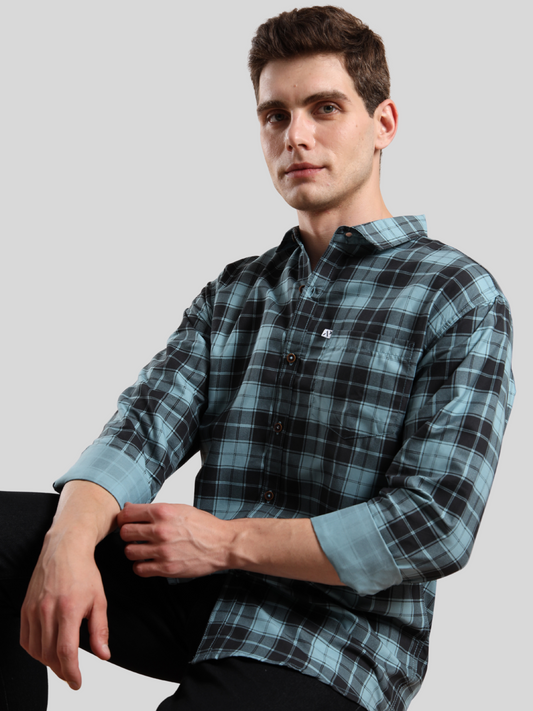 4BOXCHECKS Aqua Blue Cotton Blend Checkered Full Sleeve Shirt for Men