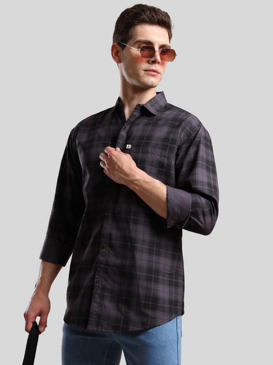 4BOXCHKS Grey and Black Check Cotton Blend Full Sleeve Shirt for Men