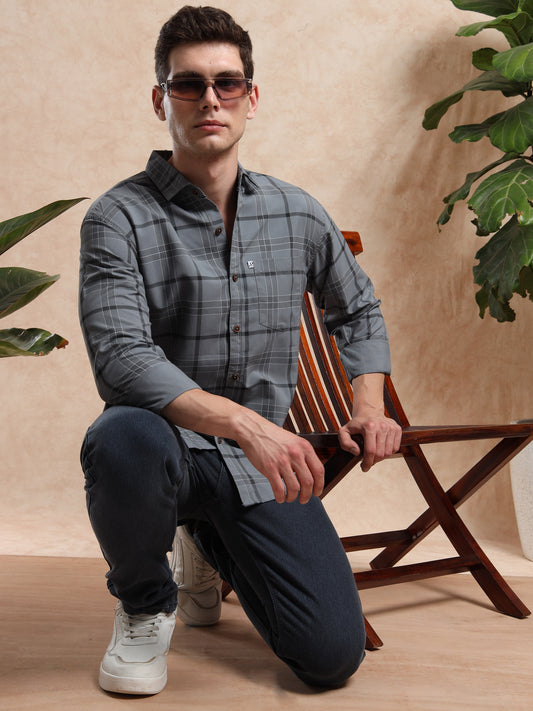 GUMMYCHKS Cotton Slate Grey & Black Plaid Shirt for Men