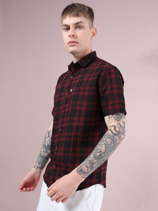 Maroon Checks Cotton Regular-Fit Half-Sleeve Shirt for Men