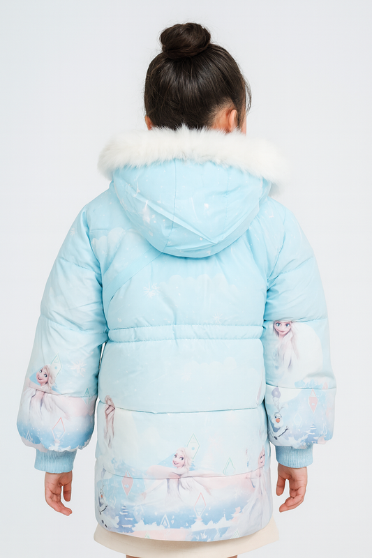 Premium Elsa Print Winter Jacket for Girls – Light Blue Puffer Coat with Fur Hood & Crossbody Bag