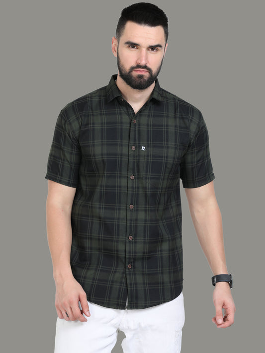 6line Green Cotton Blend Checks Half Sleeve Shirt For Men
