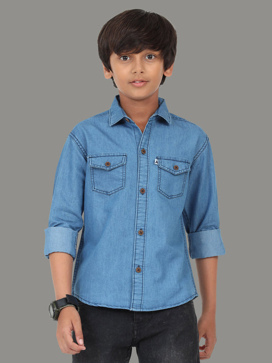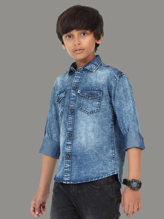 Shade Double Pocket Cut Away Collor Denim Shirt For Kids