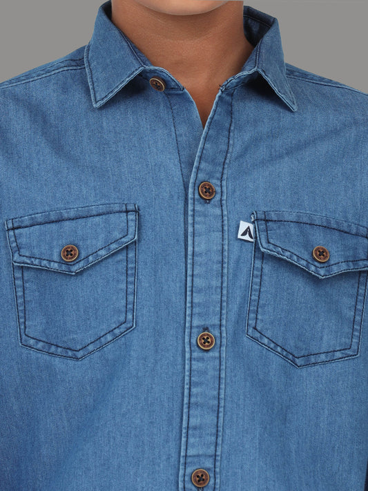 Mid Shade Double Pocket Cut Away Collor Denim Shirt For Kids