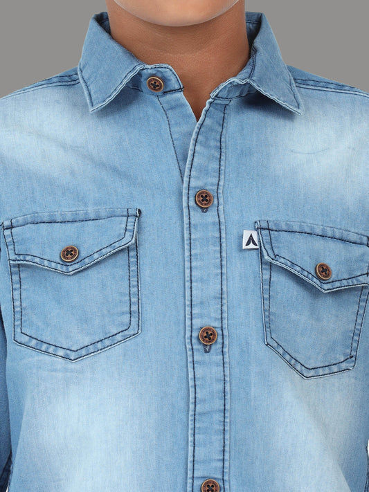 Light Shade Double Pocket Cut Away Collor Denim Shirt For Kids