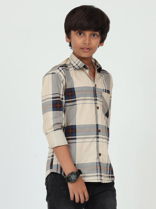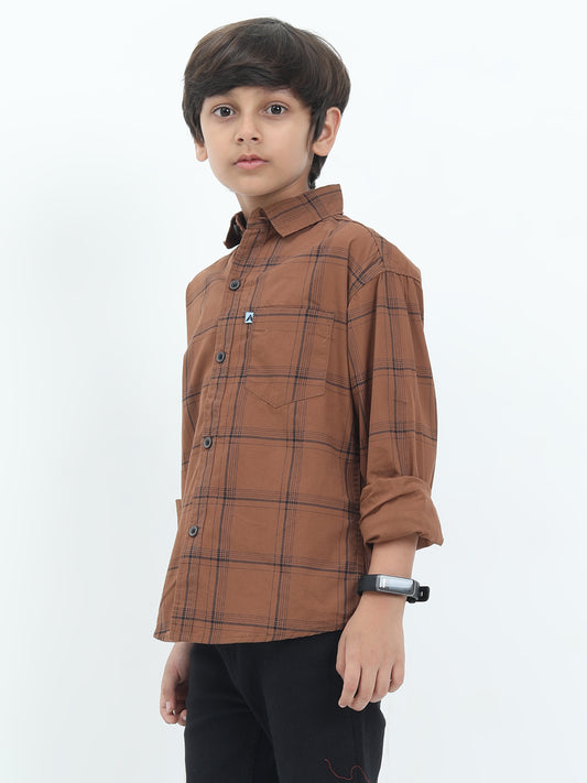 Tiger Brown Cotton Blend Checks Shirt For Kids