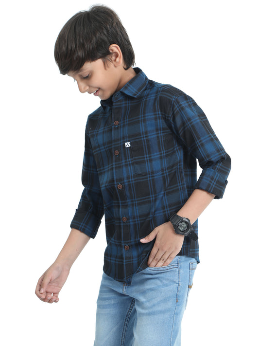Tiger Navy Cotton Blend Checks Shirt For Kids