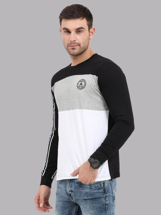 Men's Colourblocked Full Sleeves T-Shirt | Black, Grey & White Cotton Tee with Striped Sleeve