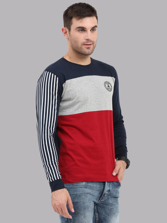 Men's Colourblocked Full Sleeves T-Shirt | Maroon, & Navy Cotton Tee with Striped Sleeve