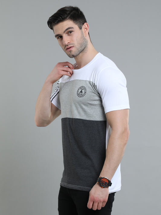 Men's Colourblocked Half Sleeves T-Shirt | Black, Grey & White Cotton Tee with Striped Sleeve