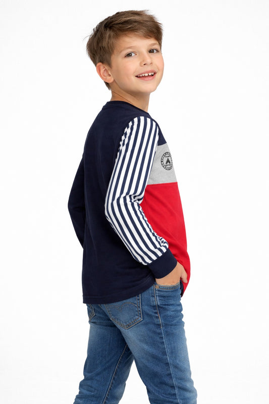 Boys Colourblocked Full Sleeves T-Shirt | Maroon, & Navy Cotton Tee with Striped Sleeve