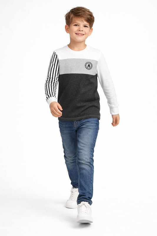 Boys Colourblocked Full Sleeves T-Shirt | Black, Grey & White Cotton Tee with Striped Sleeve