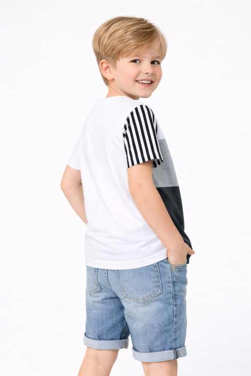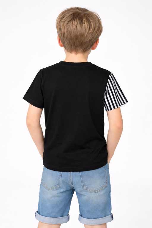 Boys Colourblocked half Sleeves T-Shirt | Black, & White Cotton Tee with Striped Sleeve